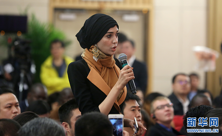 10月26日上午10:00,中國共產黨第十九次全國代表大會新聞發言人在梅地亞賓館二層新聞發布廳召開專題新聞發布會,請有關方面負責人解讀十九大報告,并回答記者關心的問題。圖為迪拜中阿衛視記者提問。新華網 王成云 攝
