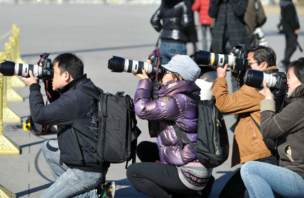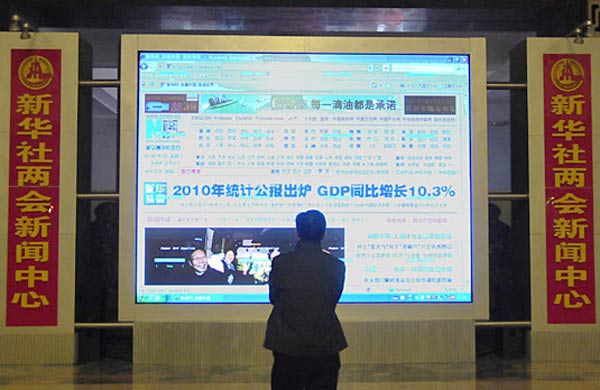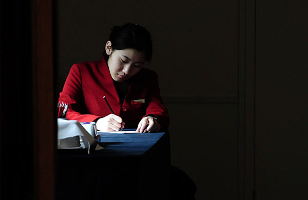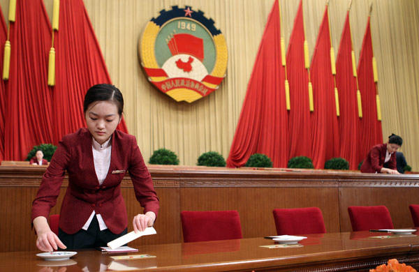 3月3日,人民大會堂的工作人員在布置會場。當日15時,中國人民政治協商會議第十一屆全國委員會第四次會議將在北京人民大會堂開幕。