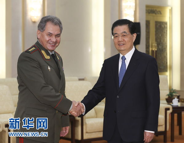 11月21日,國家主席胡錦濤在北京會見俄羅斯國防部長紹伊古。新華社記者蘭紅光攝