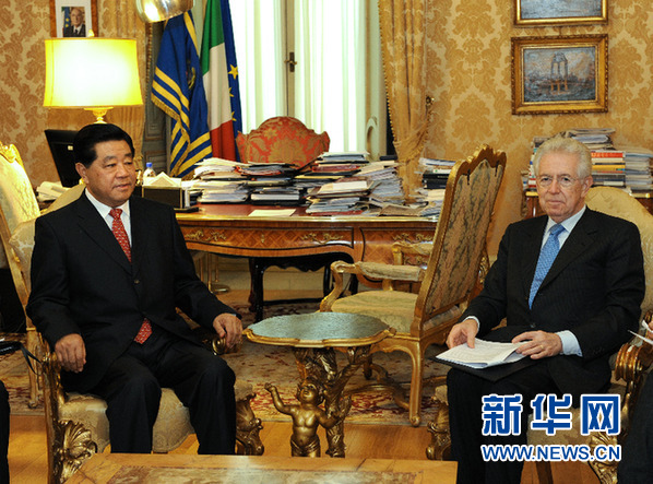 ????當?shù)貢r間11月28日,全國政協(xié)主席賈慶林在羅馬會見意大利總理蒙蒂。(來源:新華社記者 李學仁 攝)
