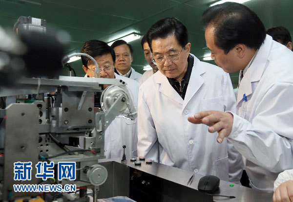????12月1日至6日,國家主席胡錦濤在貴州考察工作。這是胡錦濤在裕能科爾微電子股份有限公司深入了解企業技術創新情況。 新華社記者 鞠鵬 攝