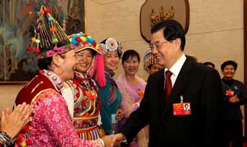 胡錦濤等黨和國家領導人走進會場,來到身著民族盛裝的少數民族代表、委員們中間,同大家親切握手,互致問候。