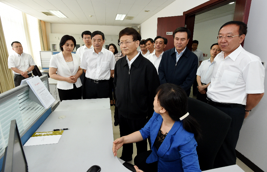 5月27日,中共中央政治局委員、中央政法委書記孟建柱在國家信訪局調研。圖為孟建柱查看國家信訪信息系統運行情況。
