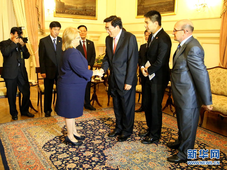 ??? 6月16日,在馬耳他首都瓦萊塔的總統府,郭金龍會見馬耳他總統普雷卡(前左一)。應邀對馬耳他進行友好訪問的中共中央政治局委員、北京市委書記郭金龍16日在瓦萊塔分別會見馬耳他總統普雷卡和總理、工黨領袖穆斯卡特。 新華社記者李佳攝
