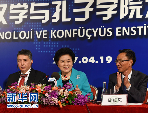 4月19日,中國國務院副總理劉延東(中)在伊斯坦布爾考察土耳其海峽大學孔子學院并與部分土耳其漢學家和孔子學院師生代表座談。新華社記者賀燦鈴攝