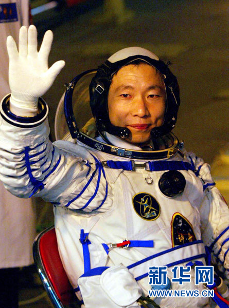 執行中國首次載人航天飛行任務的航天員楊利偉出發登艙前揮手致意(資料照片)。新華社發