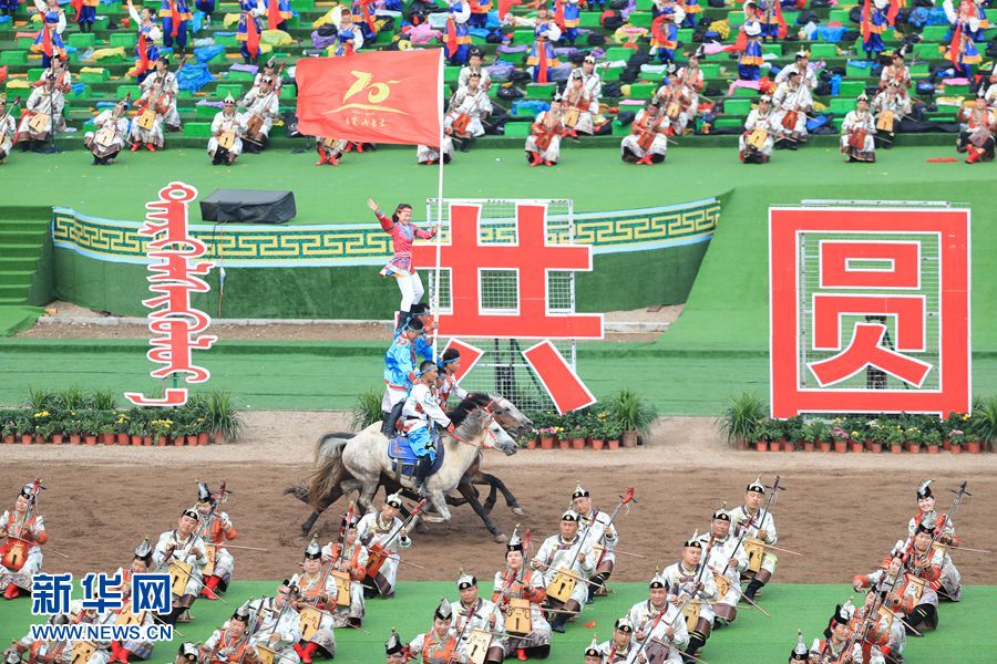 8月8日,內蒙古自治區成立70周年慶祝大會在呼和塔拉內蒙古少數民族群眾文化體育運動中心舉行。圖為群眾行進表演。新華網記者 陳杰 攝