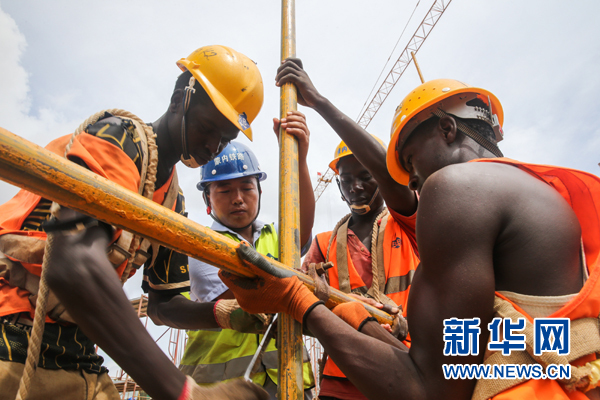 在肯尼亞蒙巴薩,中國工程師張青春(左二)和肯方工人們在蒙內鐵路蒙巴薩西站工地上工作。蒙內鐵路由中交集團總承包,中國路橋承建,連接東非最大港口蒙巴薩和肯尼亞首都內羅畢(2016年4月9日攝)。新華社記者 潘思危 攝
