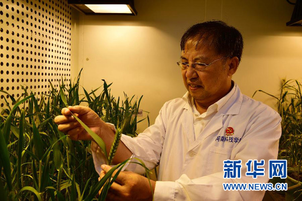 在河南科技學(xué)院小麥研究中心,小麥育種專家茹振鋼在人工氣候?qū)嶒?yàn)室查看小麥長(zhǎng)勢(shì)(9月30日攝)。新華社記者馮大鵬攝