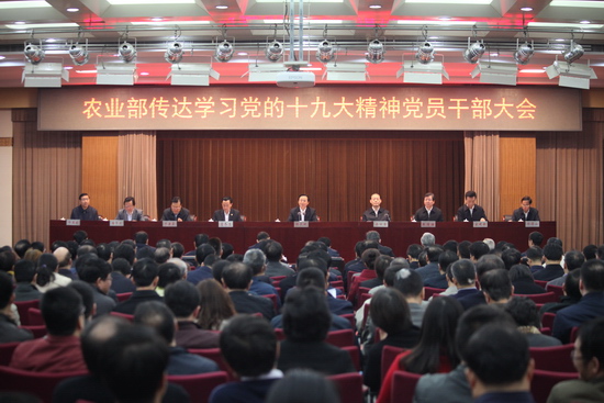 10月26日,農業部黨組書記、部長韓長賦主持召開部系統黨員干部大會,傳達學習黨的十九大精神。會議強調,農業部黨組和全體黨員堅決擁護黨的十九大作出的各項決策部署,堅決維護以習近平同志為核心的黨中央權威和集中統一領導,要把認真學習、深刻領會、全面貫徹十九大精神作為當前和今后一個時期的首要政治任務,迅速把思想和行動統一到黨的十九大精神上來,緊密團結在以習近平同志為核心的黨中央周圍,高舉中國特色社會主義偉大旗幟,認真學習貫徹習近平新時代中國特色社會主義思想,解放思想,改革創新,銳意進取,埋頭苦干,以永不懈怠的精神狀態,奮力開創農業農村經濟工作新局面。