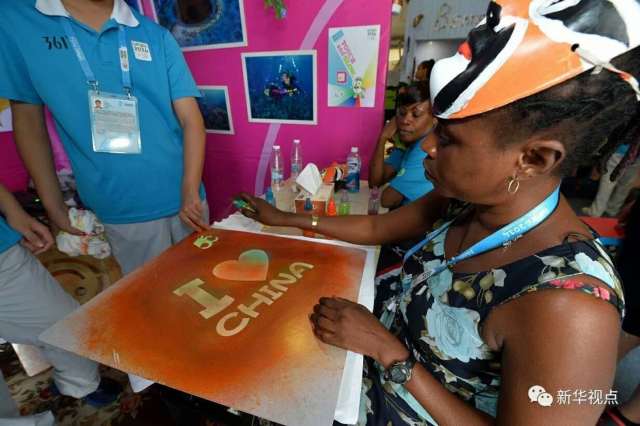 2014年8月23日,岡比亞奧委會官員在南京青奧村世界文化村制作體恤衫。新華社記者郭勇攝