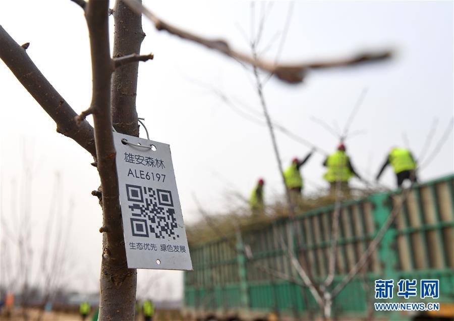 這是河北雄安新區“千年秀林”栽植苗木上的二維碼(3月21日攝)。新華社記者 牟宇 攝