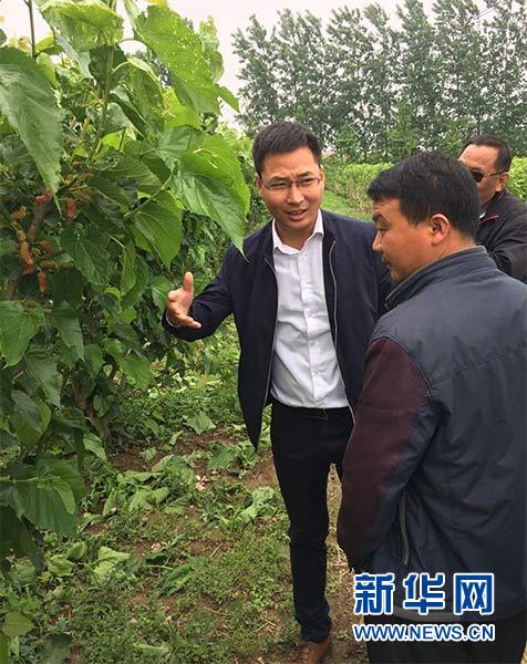 江蘇宿遷市宿城區埠子鎮蠶桑村黨支部書記周炳均(左)帶著村組干部、黨員和種植大戶30余人在徐州參觀果桑種植等項目(2017年5月4日攝)。新華社發