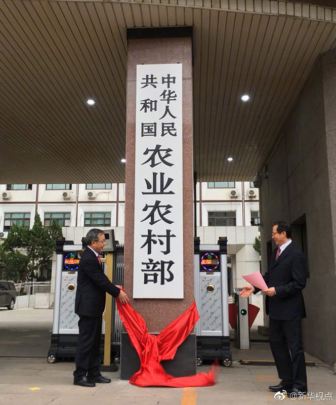 新組建的農業農村部4月3日正式掛牌。韓長賦任部長、黨組書記。(新華社“新華視點”微博 記者 董峻)