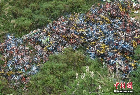 資料圖:雜亂堆放著一片共享單車。 中新社記者 張斌 攝