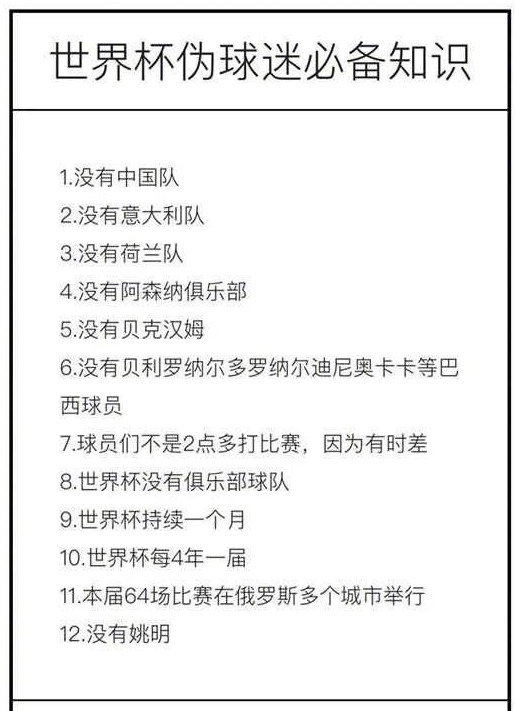 女:今天中午居然有同事問我“阿森納參不參加世界杯”。阿森納當(dāng)然不參加了,世界杯沒有俱樂部球隊。