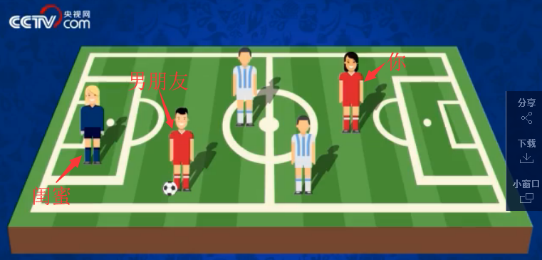 男:舉個例子,比如你和你的男朋友是一隊,你的閨蜜是對方的守門員。當(dāng)你傳球給你男朋友時,你男朋友比任何時候都更加靠近你閨蜜。此時,你的男朋友就越位啦。