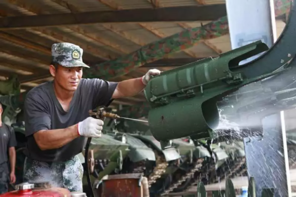 按照規(guī)定,訓(xùn)練完畢后,需對(duì)戰(zhàn)車(chē)進(jìn)行清理保養(yǎng),小編也想上去幫幫忙,手接觸到坦克鋼鐵蓋時(shí),一下子被燙的縮了回來(lái)。