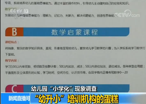 在北京另外一家培訓機構的學前班的招生廣告上,記者看到這個面向5—6歲兒童的全日制學前班,其教學內容包括:學習100以內單雙數、相鄰數及按群計數,50以內加減法、各種類型應用題、認讀聲母單韻母復韻母,整體認讀音節等。同時包括數學啟蒙、思維訓練等課程。所有涉及小學一年級課程學習內容課程基本都能在機構學前班找到,有的培訓機構的課程種類甚至達到數十種。