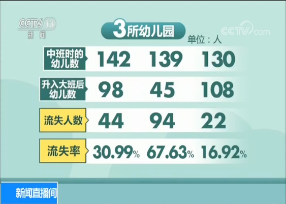 據北京一位在幼兒園工作多年的教師,對周邊3所幼兒園大班孩子進行的調查顯示,每年從中班升入大班以后,孩子數量都會有所減少,特別是在大班第二學期流失更為嚴重。3所幼兒園中班時的幼兒數分別為142、139、130,升入大班后的幼兒數分別為98、45、108,分別流失了44人、94人、22人,流失率分別為30.99%、67.63%、16.92%。這些大班“輟學”的孩子大多去了以幼小銜接名義舉辦的學前班,提前開始小學學習。