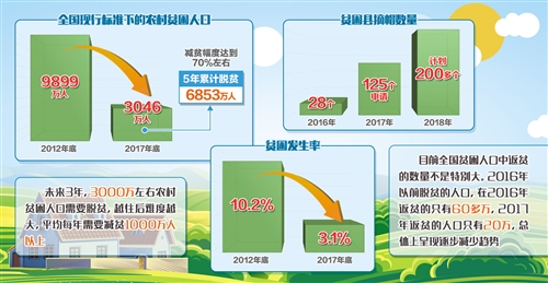 在以習近平同志為核心的黨中央堅強領導下,脫貧攻堅力度之大、規模之廣、影響之深前所未有。經過幾年的努力,脫貧攻堅取得決定性進展:全國現行標準下的農村貧困人口由2012年底的9899萬人,減少到2017年底的3046萬人,5年累計脫貧6853萬人,減貧幅度達到70%左右。貧困發生率由2012年底的10.2%下降到2017年底的3.1%。貧困縣數量實現了首次減少,2016年有28個貧困縣脫貧摘帽,2017年有125個貧困縣申請摘帽,今年計劃200多個縣摘帽,解決區域性整體貧困邁出堅實步伐。貧困地區群眾生產生活條件明顯改善,貧困群眾收入水平明顯提高、獲得感明顯增強。