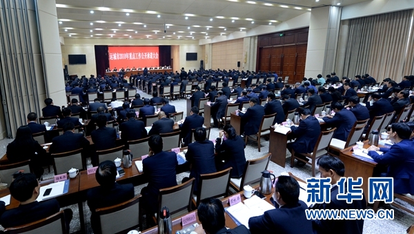 運(yùn)城市2018年重點(diǎn)工作公開承諾大會會場(4月10日攝)。新華社發(fā)