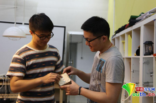 清華大學創客空間協會成員張承巍(左)與畢瀅(右)正在介紹他們的創意成果“音樂盒子”。資料圖
