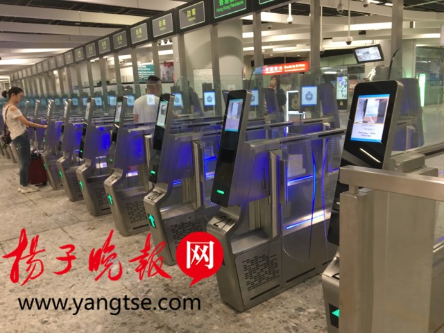 香港西九龍站實(shí)行“同層兩檢”。跨過這一條黃線就來到了香港口岸區(qū)。記者在進(jìn)入香港入境待檢區(qū)域后,首先看到有三處設(shè)置體溫檢查的柜臺。再往里走,即是香港居民入境通道。一排閘機(jī)依次排開,港澳通行證放上即可通過。不過首次來港的旅客需要從人工柜臺入關(guān)。記者到達(dá)時,辦理香港入境程序的人較少,整個用時不到2分鐘,就完成辦理了入境程序。而在完成香港入境程序后,即可到檢票閘機(jī)處刷票出閘。從下車到入關(guān),記者一共花了約15分鐘。“現(xiàn)在正是小長假,如果沒有坐高鐵而是選擇從福田口岸過關(guān),1個小時都搞不定。”一位福田游客告訴記者。