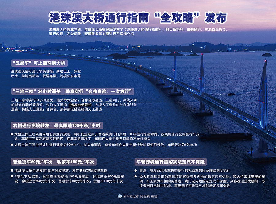 新華社廣州10月21日電(記者 周強(qiáng))港珠澳大橋通車在即,港珠澳大橋管理局發(fā)布了《港珠澳大橋通行指南》,對大橋路線、車輛通行、三地口岸通關(guān)、通行收費(fèi)、安全保障、配套服務(wù)等方面進(jìn)行了詳細(xì)介紹。