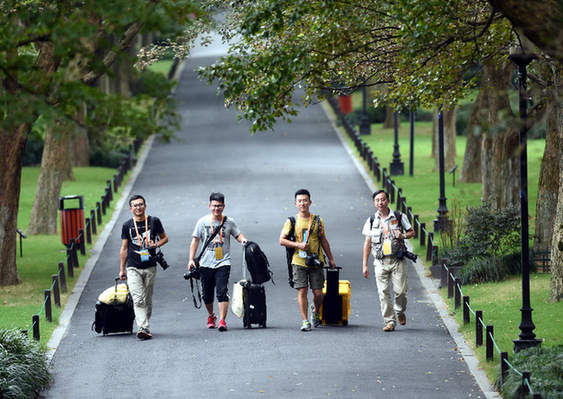 圖為金立旺(左一)2016年9月4日在西湖蘇堤準備采訪G20峰會