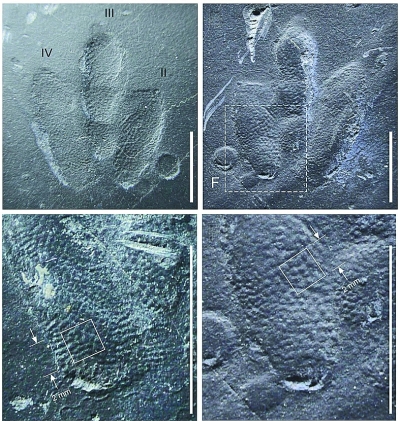 古生物學(xué)家還發(fā)現(xiàn),小龍足跡的鱗片模式與其他肉食性獸腳類(lèi)恐龍的足跡相似,而明顯區(qū)別于古鳥(niǎo)類(lèi)的腳底鱗片模式。此前發(fā)現(xiàn)的肉食性獸腳類(lèi)恐龍足跡的鱗片要大得多,直徑可達(dá)2厘米左右,大約一個(gè)硬幣那么大。“這表明所有的獸腳類(lèi)恐龍都有類(lèi)似的鱗片模式,小龍足跡上精致的保存完好的鱗片模式,就像比它大得多的近親鱗片的縮小版。”邢立達(dá)說(shuō)。(記者張蕾)