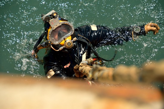 因為經常要在淤泥里探摸,潛水員在水底的移動大多都是“爬”著完成。在韓國搜尋“世越號”沉船遇難者遺骨時,潛水員就是爬著,把沉船方圓5海里的海底,每一寸都摸了一遍。