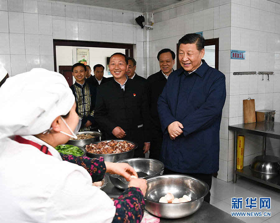 考察一所小學,他走進師生食堂,仔細察看餐廳、后廚,了解貧困學生餐費補貼和食品安全衛生情況;