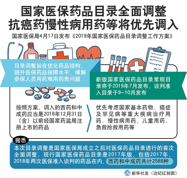 新華社北京4月18日電(記者張泉)國(guó)家醫(yī)保局17日發(fā)布《2019年國(guó)家醫(yī)保藥品目錄調(diào)整工作方案》,目錄調(diào)整旨在優(yōu)化藥品結(jié)構(gòu),提升醫(yī)保藥品保障水平,緩解參保人員用藥難用藥貴問(wèn)題。新版國(guó)家醫(yī)保藥品目錄常規(guī)目錄將于今年7月發(fā)布,談判準(zhǔn)入目錄于9-10月發(fā)布。