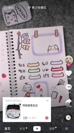 記者在用青少年模式瀏覽抖音所推送的視頻時看到,不少視頻內容上傳者在展示繪畫、書法等技巧時,左下角總會“恰到好處”地彈出視頻中所使用的工具購買鏈接。