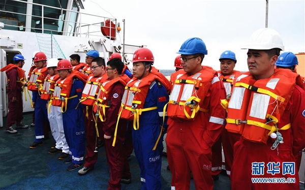5月19日,科考隊員在甲板集合準備登上救生艇。新華社記者 張旭東 攝