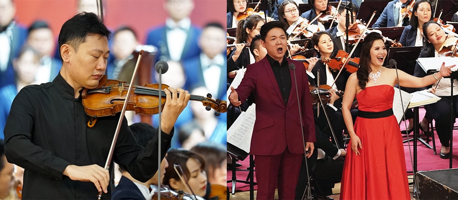 擔任《梁祝》小提琴獨奏的陳曦(上左),17歲就獲得第12屆柴可夫斯基國際音樂比賽小提琴銀獎,那屆金獎可是空缺的哦。青年男高音歌唱家王傳越(右圖左)曾獲2015年第15屆柴可夫斯基大賽銀獎,女高音歌唱家宋元明(右圖右)曾獲第48屆法國圖盧茲國際聲樂大賽第一名。