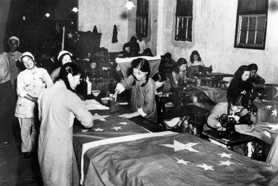 趕制國旗時臉上真摯的笑容。