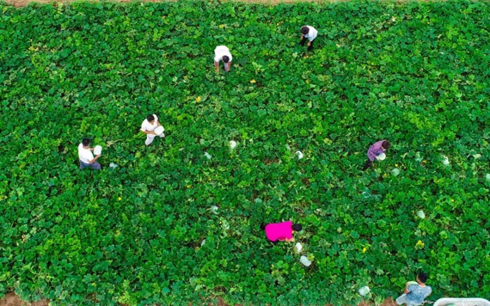 2019年7月7日,河北故城縣建國鎮(zhèn)姜圈村蔬菜基地,種植戶在采摘冬瓜。(新華社記者李曉果 攝)