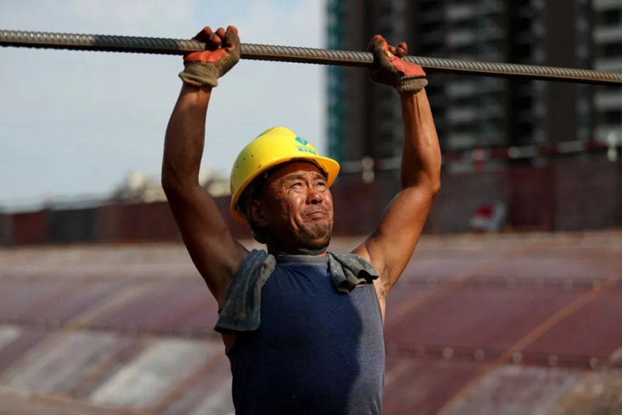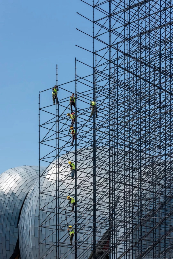 7月1日,山西大同。烈日下,數十米高的鋼架上,工人們仍在奮戰。作者:王京