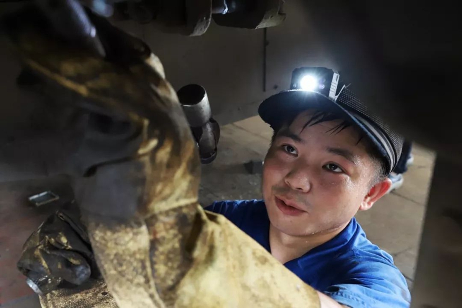 9月20日,河北秦皇島。工人正在維修鋼管。作者:王金磊