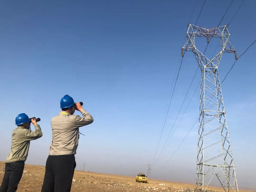 10月1日,內蒙古錫林郭勒盟。電業局輸電工人正在巡視輸電線路。作者:雨濛
