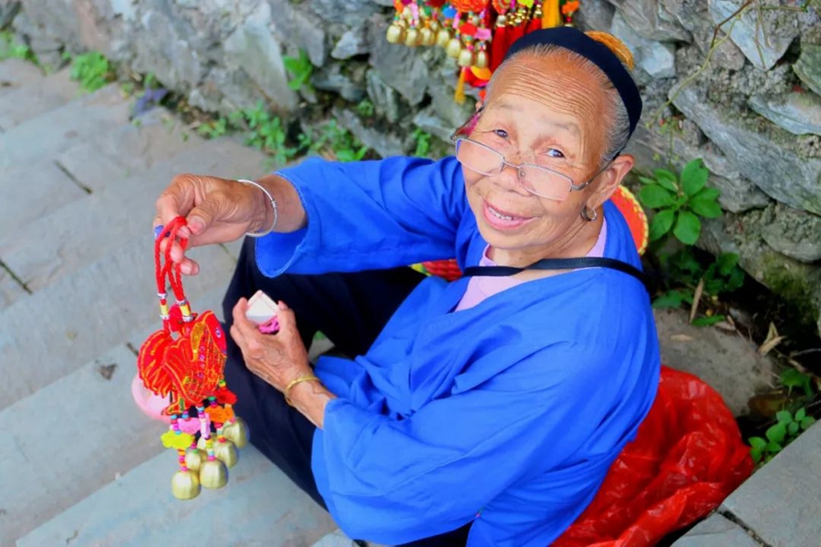 9月1日,廣西桂林。一位在景區編織五彩鈴的老奶奶。作者:zeus