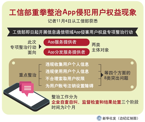 新華社北京11月4日電(記者張辛欣)記者4日從工信部獲悉,工信部即日起開展信息通信領域App侵害用戶權益專項整治行動。對違規收集用戶個人信息、違規使用用戶個人信息等8類突出問題重拳整治。