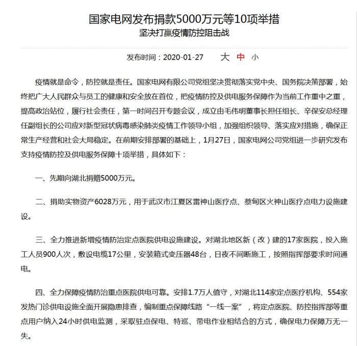 今日,國家電網在官方網站發布《國家電網發布捐款5000萬元等10項舉措,堅決打贏疫情防控阻擊戰》,要求全力確保民生用電,疫情防控期間,居民用電客戶采取欠費不停電措施。