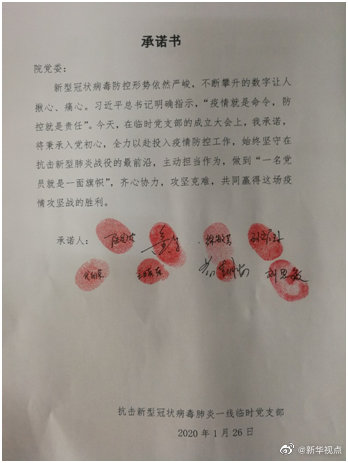 “我承諾,將秉承入黨初心,全力以赴投入疫情防控工作……”應對疫情,湖北省中醫(yī)院新型冠狀病毒肺炎抗擊一線臨時黨支部成立。黨支部成員由感染科、肺病科、ICU、檢驗科等醫(yī)、技、藥、護、行政、后勤等科室的66名黨員構成。多名臨時黨支部成員還簽下承諾書,表示將主動擔當作為,做到“一名黨員就是一面旗幟”。(記者 梁建強)