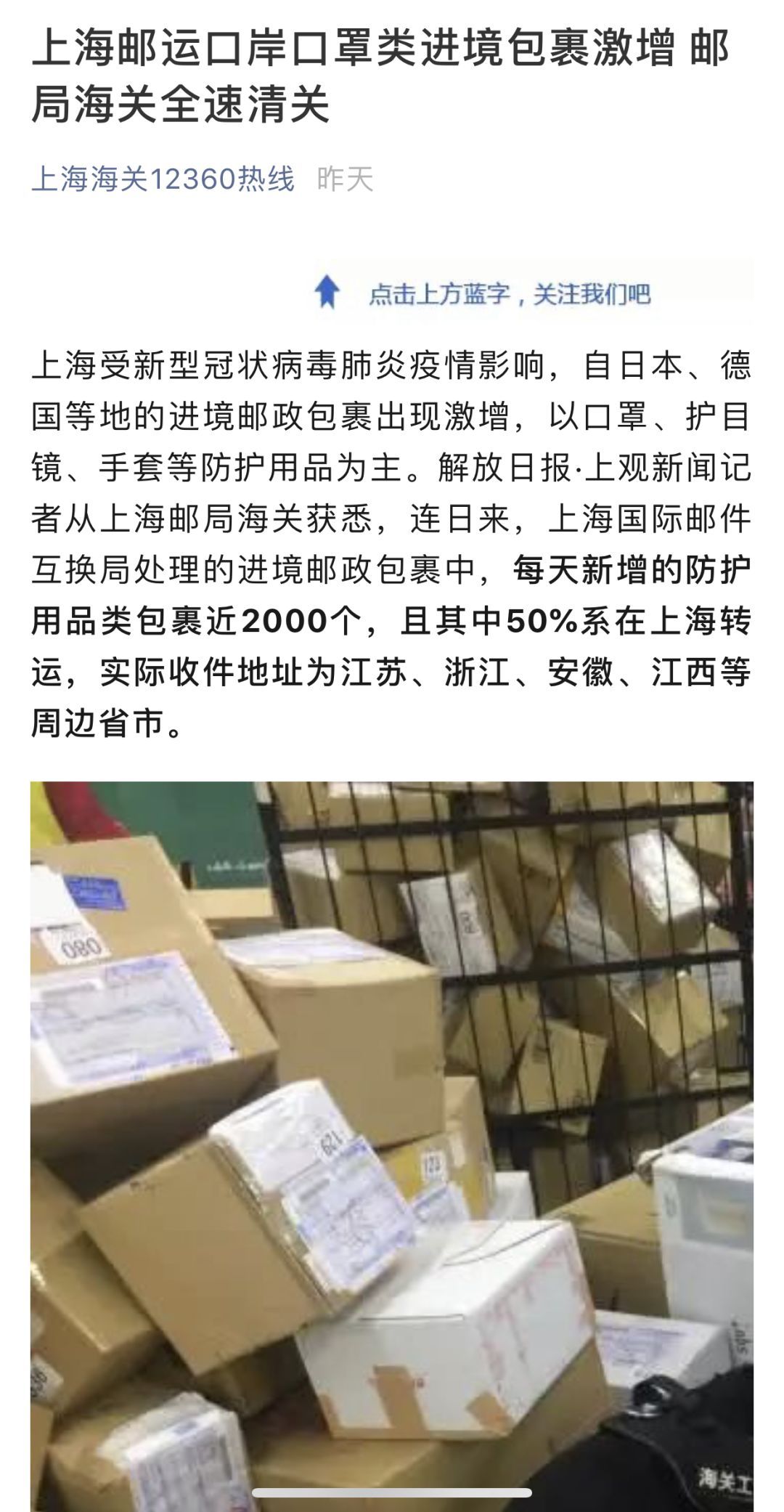 (上海郵運口岸口罩類進境包裹激增 郵局海關全速清關)