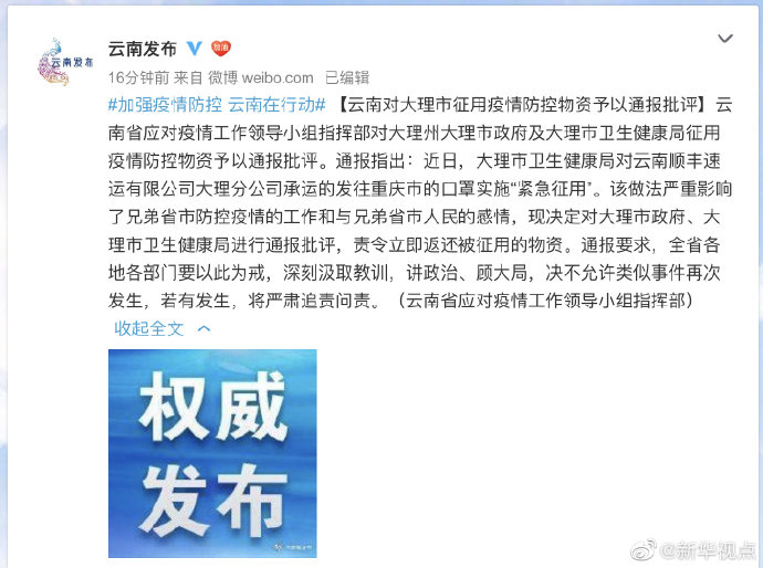 云南對大理市征用疫情防控物資予以通報批評-新華網