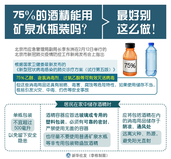 新華社北京2月13日電(記者丁靜)越來越多的人選擇常備75%的乙醇(俗稱酒精)進行家庭和個人消毒。那么,75%的乙醇可以裝在礦泉水瓶里嗎?北京市應急管理局副局長李東洲在12日舉行的北京市新冠肺炎疫情防控工作新聞發布會上稱,最好別這么做。