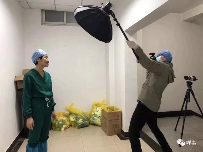鐘銳鈞說,在拍攝的兩天內,他一直守在漢口醫院的隔離區外,等到醫護人員出門便走上前去,讓每個人只停留一分鐘,一手舉燈一手持相機完成拍攝。